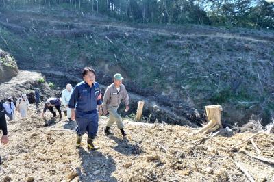 仁比氏らは伐採で山肌があらわになった斜面を登り、国有林側から多量の石が流れ出した民有林や土砂に埋まった山水の取水路、水の力で壊された用水路の壁などを確認しました。